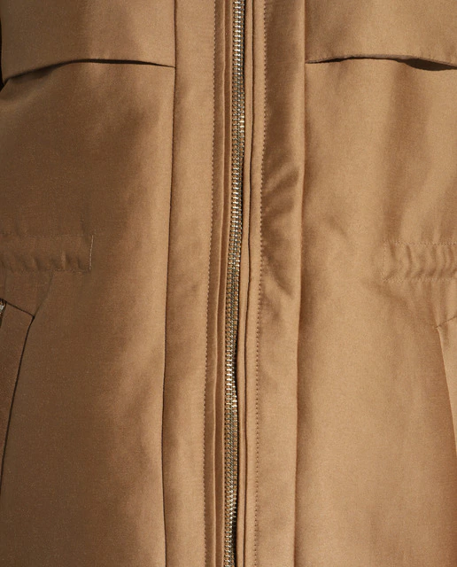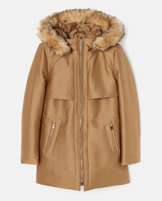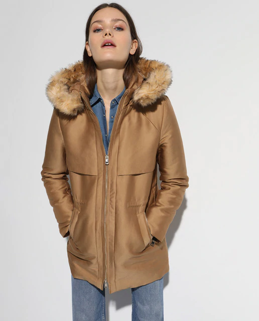 Parka satinada con capucha con pelo. Tiene cierre de cremallera y dos bolsillos.